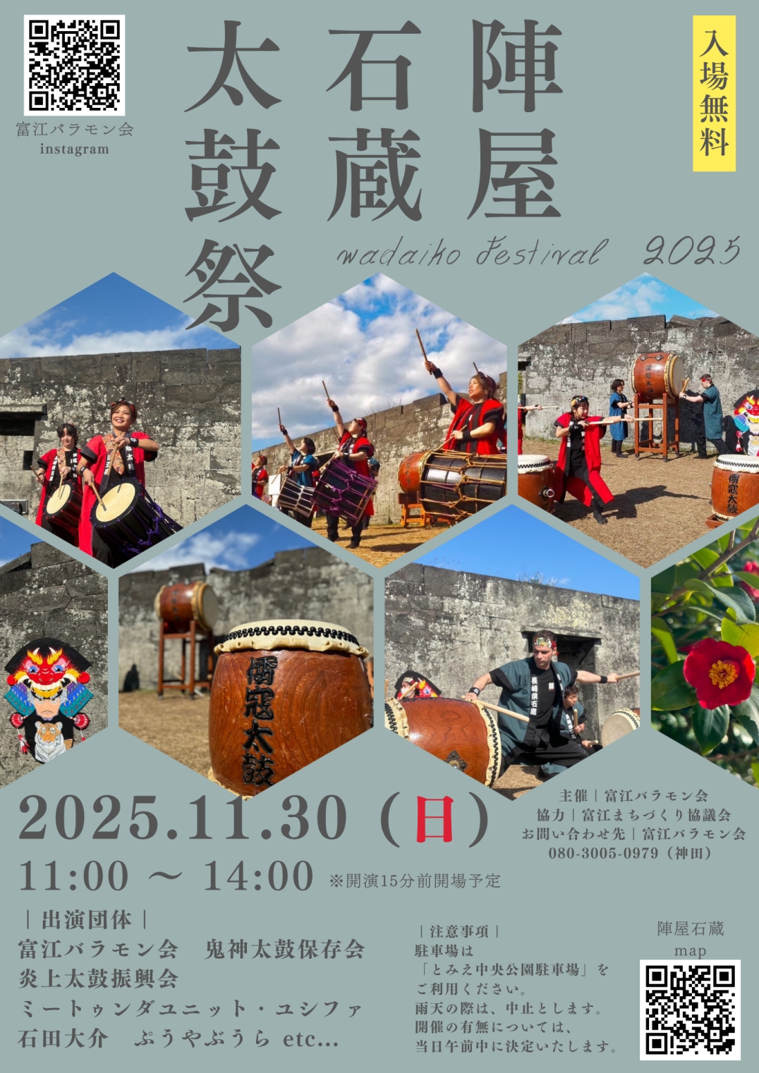2025年11月30日、陣屋石蔵太鼓祭を開催します。福江の炎上太鼓や岐宿の鬼神太鼓も参加してくれます。お越しください。