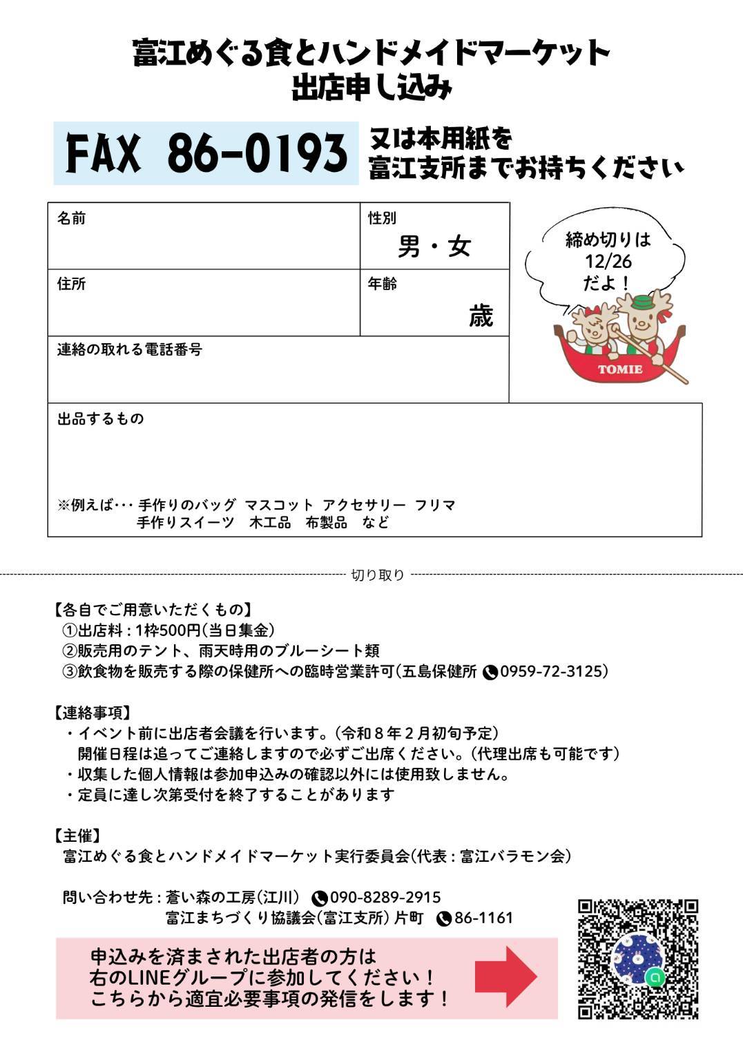 - 2026年3月8日(日)富江めぐる食とハンドメイドマーケットを開催します。アクセサリー、インテリア、衣類、スイーツなど何でもOK!手作りの品を販売してみませんか?